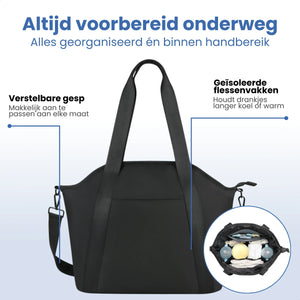 Denna vattentäta och isolerade skötväska är designad för att hålla alla dina babyartiklar, flaskor och tillbehör organiserade, svala och lättillgängliga. Komplett med praktiska barnvagnskrokar.